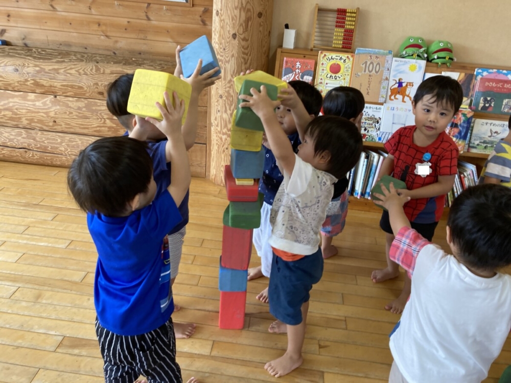 二歳は、沢山積み木を積んで遊びました。