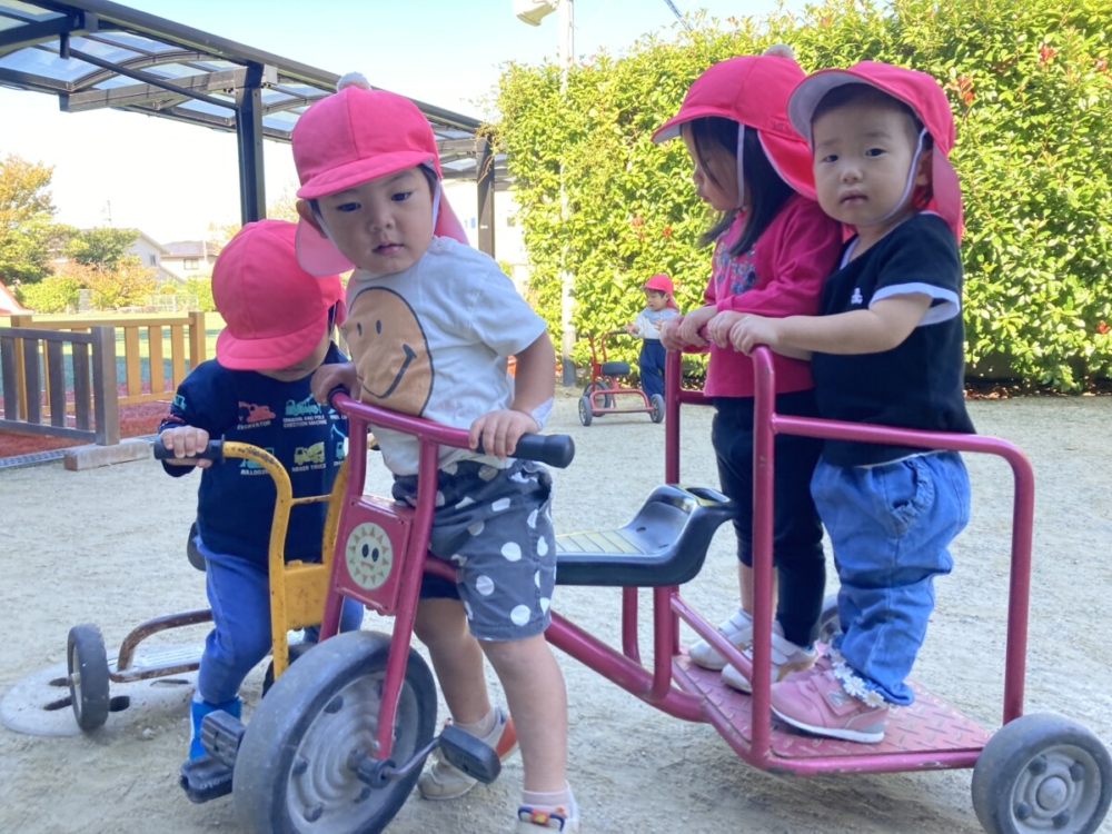 大きな三輪車ではお友達を乗せたり、乗ったりと
