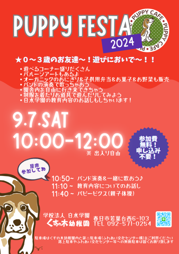 NEWS PUPPY FESTA 2024.8.5 < PREV NEW 2025.12.8 12月10日(水)… 2025.12.4 ★森の木幼稚園pu… 2025.11.30 森の木幼稚園12月… 2025.11.28 puppy caf… 2025.11.28 くすの木幼稚園12… 2025.10.6 くすの木幼稚園で1… 2025.10.6 入園説明会のご案内 2025.10.2 PUPPY FES… 2025.9.30 puppy caf… CATEGORY 森の木 くすの木 もみの木 2園から リクルート 未就園児クラス その他 ARCHIVE 2025年 2024年 2023年 2022年 2021年 2020年 2019年 検索