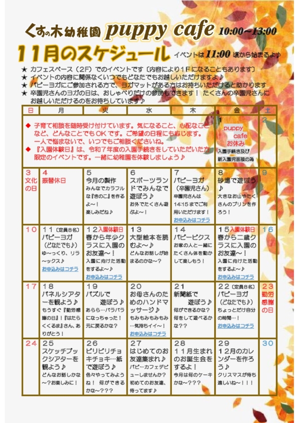 NEWS くすの木11月カレンダー 2024.10.30 < PREV NEW 2025.12.8 12月10日(水)… 2025.12.4 ★森の木幼稚園pu… 2025.11.30 森の木幼稚園12月… 2025.11.28 puppy caf… 2025.11.28 くすの木幼稚園12… 2025.10.6 くすの木幼稚園で1… 2025.10.6 入園説明会のご案内 2025.10.2 PUPPY FES… 2025.9.30 puppy caf… CATEGORY 森の木 くすの木 もみの木 2園から リクルート 未就園児クラス その他 ARCHIVE 2025年 2024年 2023年 2022年 2021年 2020年 2019年 検索