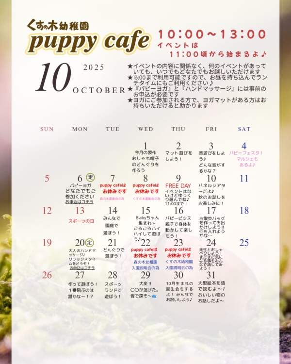 NEWS カフェカレくす10月 2025.9.30 < PREV NEW 2025.12.4 ★森の木幼稚園pu… 2025.11.30 森の木幼稚園12月… 2025.11.28 puppy caf… 2025.11.28 くすの木幼稚園12… 2025.10.6 くすの木幼稚園で1… 2025.10.6 入園説明会のご案内 2025.10.2 PUPPY FES… 2025.9.30 puppy caf… 2025.9.26 保護者の皆様へ く… CATEGORY 森の木 くすの木 もみの木 2園から リクルート 未就園児クラス その他 ARCHIVE 2025年 2024年 2023年 2022年 2021年 2020年 2019年 検索