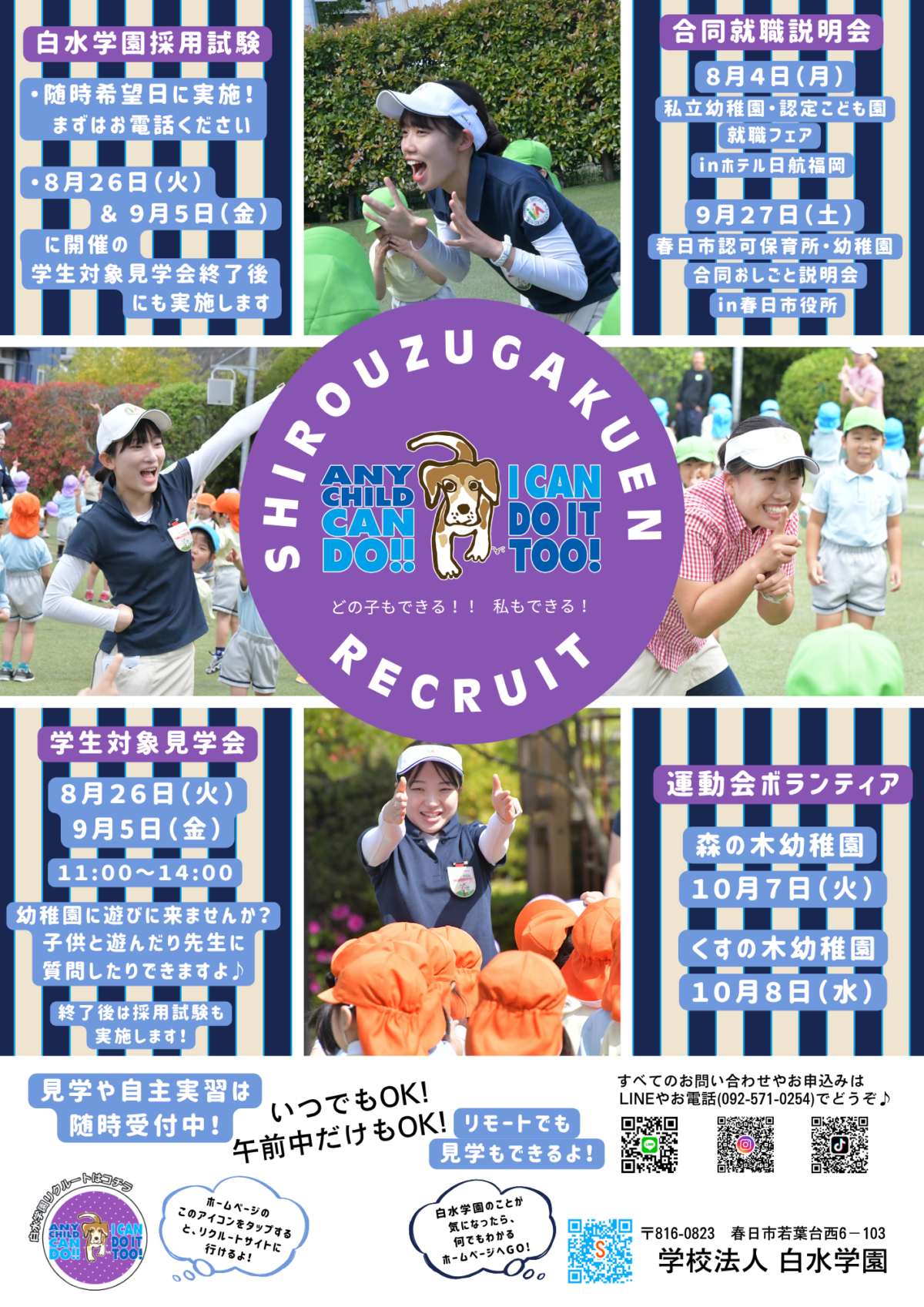 NEWS リクルート 学生の皆さんお待ちしています♪ 2025.7.8 学生の皆さん! 森の木幼稚園やくすの木幼稚園に 是非お越しください♪ 見学だけでもOK! もちろん、自主実習もOK! 運動会ボランティアも募集中! 実際に来てみると雰囲気もよくわかりますよ♪ いつでもお待ちしています!! < PREVNEXT > NEW 2025.7.9 見学においで! 2025.7.8 就職フェア開催! 2025.7.8 学生の皆さんお待ち… 2022.8.24 『行ってみ隊』土曜… 2021.9.17 運動会ボランティア… 2021.9.8 令和4年度 採用試… 2021.9.8 第2回 行ってみ隊 2021.9.8 令和3年度運動会ボ… 2021.3.2 『気軽に尋ねてみ隊… ARCHIVE 2025年 2024年 2023年 2022年 2021年 2020年 2019年 検索