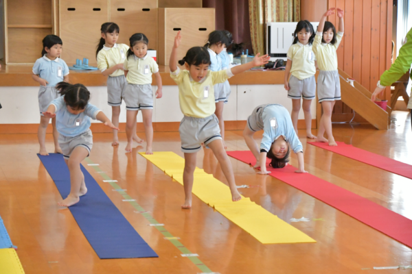 年長は体操でそれぞれの技の練習を頑張っています。