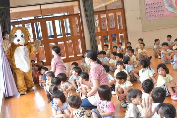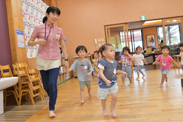 二歳は保育室で笛の音に合わせて走ったり、止まったりして