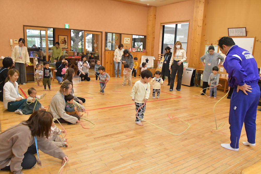縄跳びを使って、縄をぐるぐる回したり、