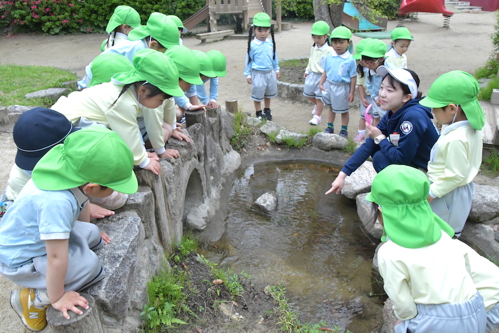 池の生き物に興味津々!