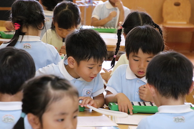 鍵盤ハーモニカでも友達と確認し合いながらする姿が