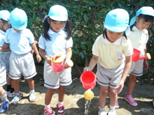 さて今日は、年中組がジャガイモの苗を植えました。一学期にはトマト、そしてジャガイモ…と栽培をする楽しさ、自分で収穫する喜びを味わうことができるように、保育に取り入れています。砂場の砂を触ることとは違い、丁寧に種イモに土をかぶせる子ども達。