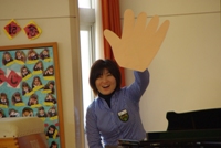 そして、今日は1月生まれのお友達の誕生会でした。誕生会の中で、中川先生の耳や太田先生の手が大きくなる不思議なおまじないがあり…