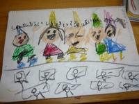 「め組」をおどっているところですかね~(^-^)描いている最中には、音楽に合わせて手を動かしたり、リズムを刻んだりしながら描く子どももいましたよ。