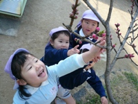 ↓暖かい陽を浴びて、園庭の桃もつぼみをつけていますよ。子ども達も今か今かと花が咲くことを心待ちにしています!