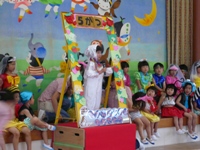 そして、お昼からは、5月生まれの子の誕生会がありました。自分で選んだ衣装を着て、好きな食べ物、将来の夢、おうちの方へのメッセージを元気に発表していましたよ。さらに、今回の衣装には、可愛らしいうさぎの着ぐるみ(今年初登場です(^O^))を着ている子が!
