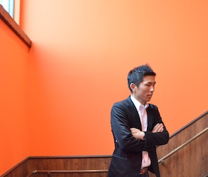 ↓ 石川先生…新しくなった階段踊り場の壁紙と共に