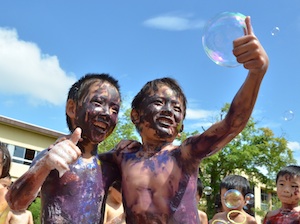 赤・青・黄・緑の絵の具を体に塗って喜んでいた子ども達は、全ての色を混ぜて体や顔に塗りたくり、もはや、誰かわからないくらいになっていました(^_^;)