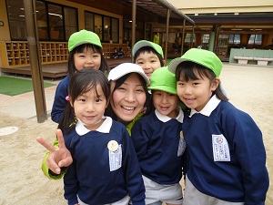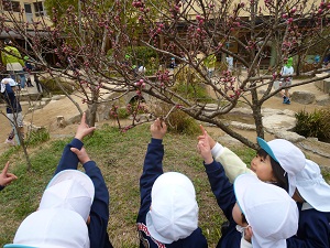桃のつぼみを触ったり、梅の花を眺めたりと