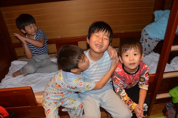 就寝準備をして寝る直前の様子。絡み合っている男子達。消灯後はぐっすり眠っていました。