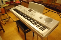 昨年度購入し、音楽室だけでなくキンダーホールにも持ち運びしながら使用しています。楽器専門店の方からお勧めされた超最新電子キーボードです。何種類もあるリズム・音程・速度・自動伴奏付き、さらにSDカードに保存ができる、まさにコンピューター化されたキーボード! こんな楽器が幼稚園にあるなんて…幸せ者です!