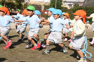 三学年で手をつなぎ、しっぽ取りをしていました。