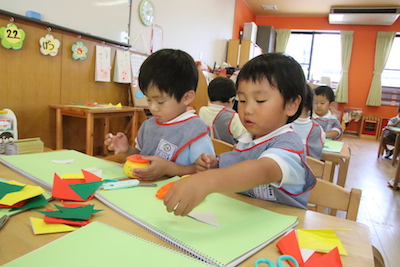 折り紙を折って、はさみを使って、のりで貼って・・・