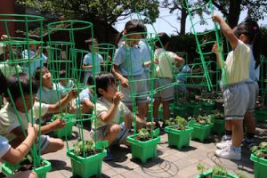 朝顔の支柱を立てました。