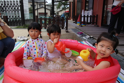 こちらは、ジョウロやコップを使って水遊び~気持ち良さそうですね☆