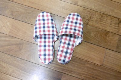 赤と青のチェック柄のスリッパです。