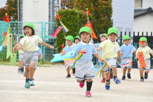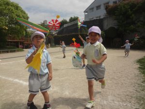 「先生~!こいのぼりが泳いでるね~。みて!風車も回っとーよー!」