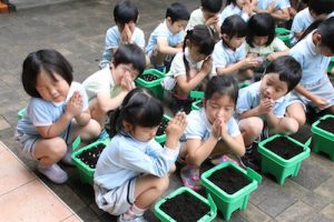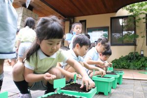 朝顔の種植えでは、バスの先生にお手伝いして頂き鉢に土を入れました。