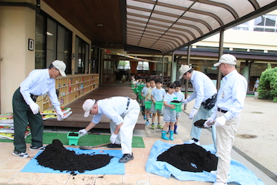 朝顔の種植えでは、バスの先生にお手伝いして頂き鉢に土を入れました。