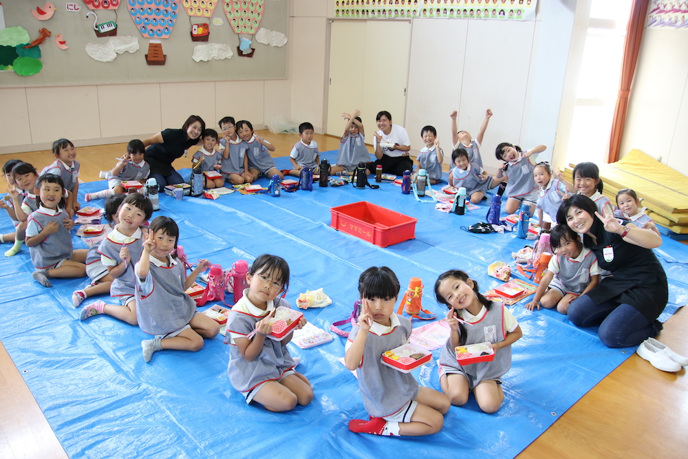 そして今日、年長はキンダーホールでパートごとに給食を食べました!