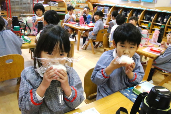 そして、今日は年長が自分達で育てたお米でおにぎりを作りました!!