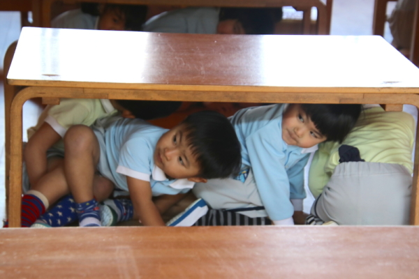 先生の話を聞いて机の下に隠れ、