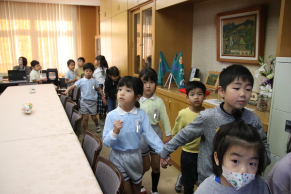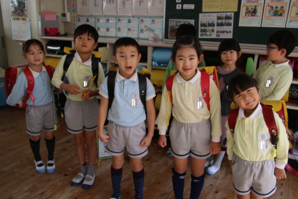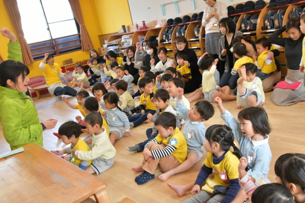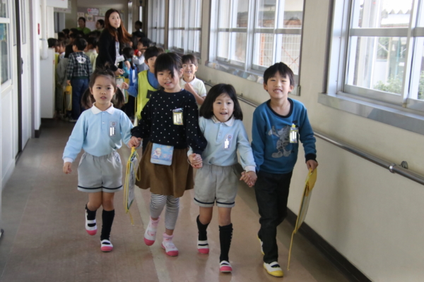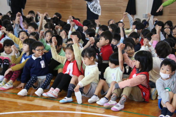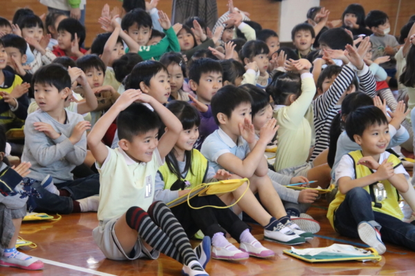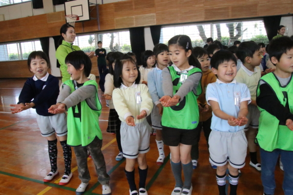 小学生のお兄さんとお姉さんとペアを作って大きな声で
