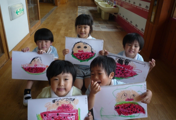 さくら組は、指スタンプですいかを描きました。