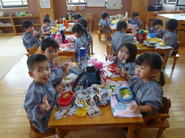 お弁当タイム!お母さんが作ってくれたお弁当を嬉しそうに食べていますよ!