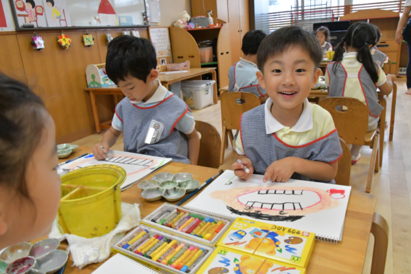 年長組は自由画帳に自分の歯の絵を描きましたよ。