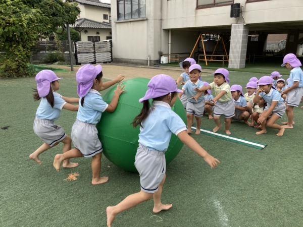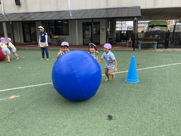 自分よりも大きな大玉を三人で力を合わせて転がします!