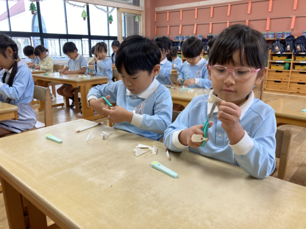 折り紙を折って、ハサミでジグザグジグザグ・・・