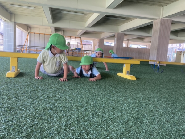 平均台を潜ったりしてかけっこをしました。