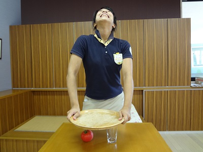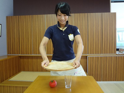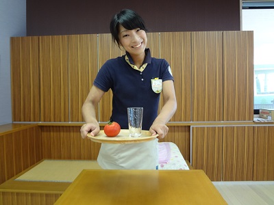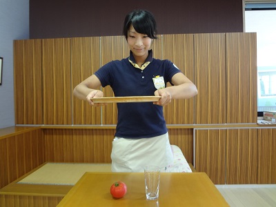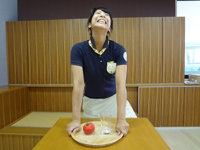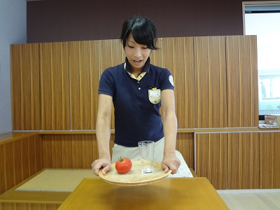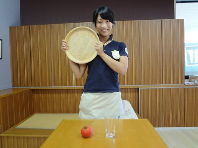 今からコップとトマトを貫通させてお盆にのせます!