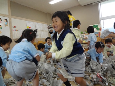 新聞紙のシャワーをしたりして、