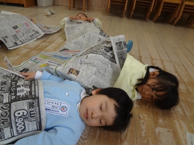 新聞紙遊びをしました☆新聞紙でお昼寝をしたり、