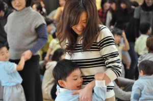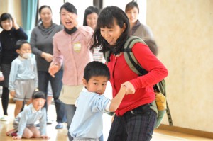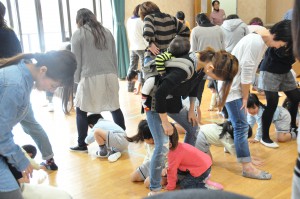 最初のゲームは親子で!ペンギン歩きゲーム!
