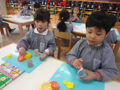 年少は、紙皿や折り紙を使って