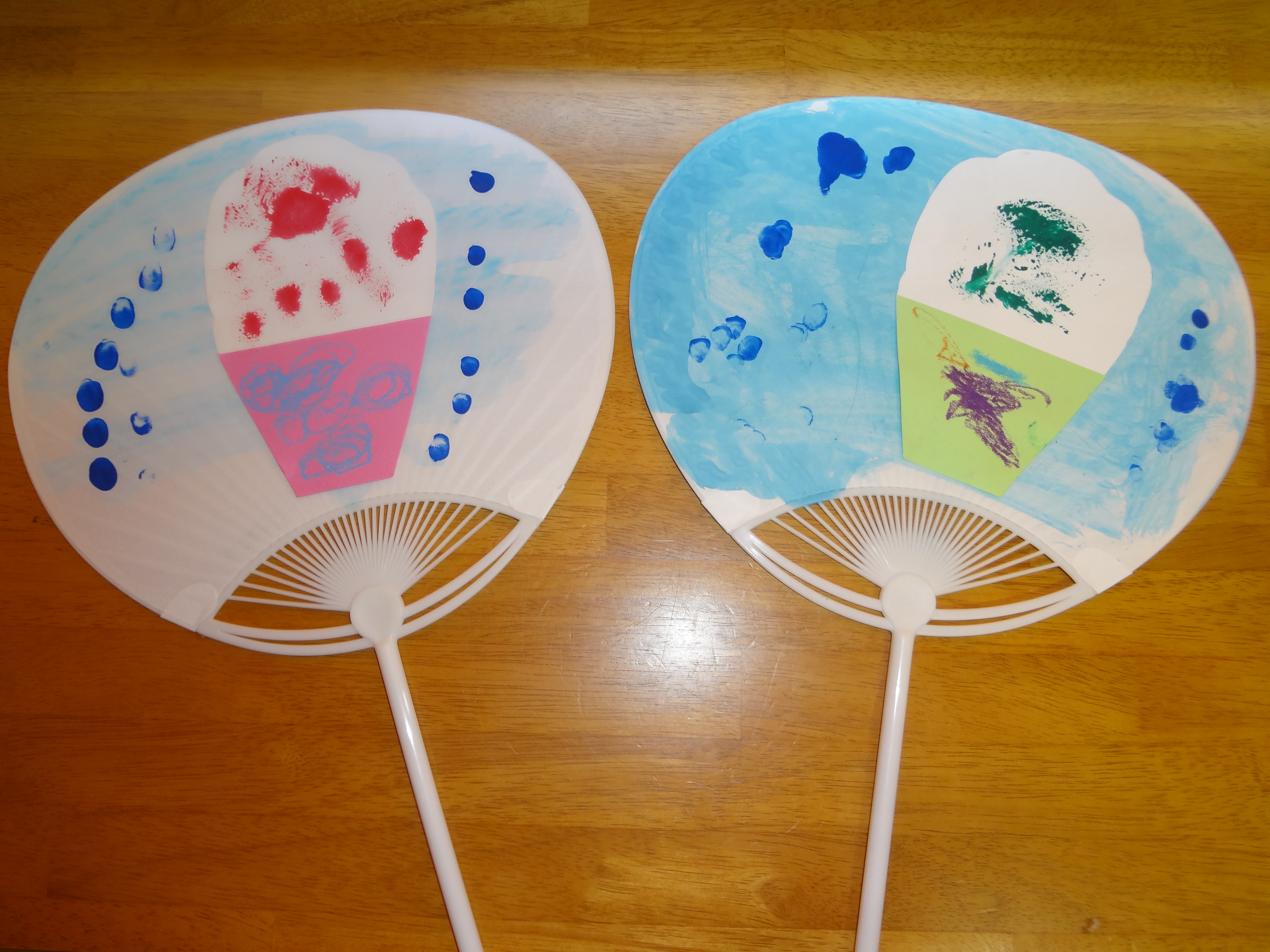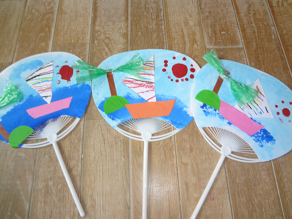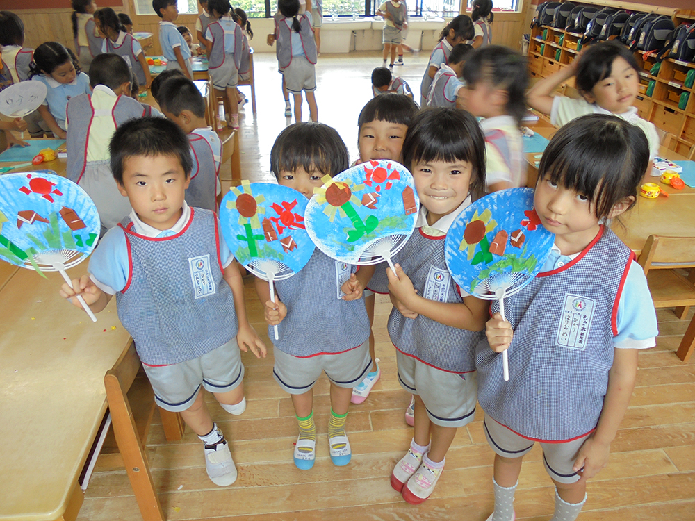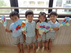 さて、今日は年長が団扇を作っていました。