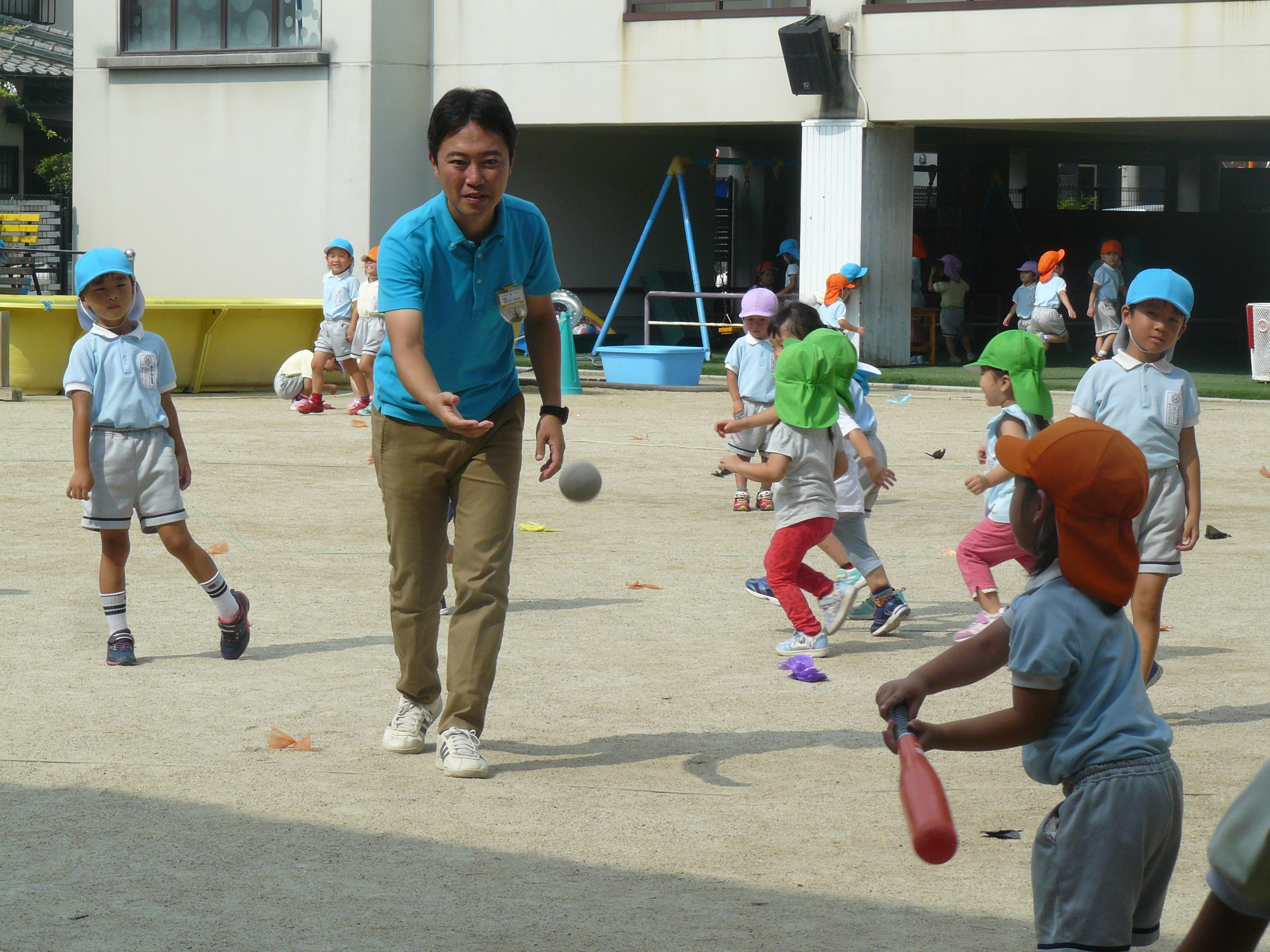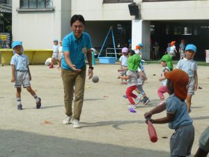 園庭では、園長先生の投げるボールを