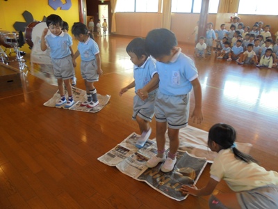 三階の音楽室では、新聞紙の橋渡り