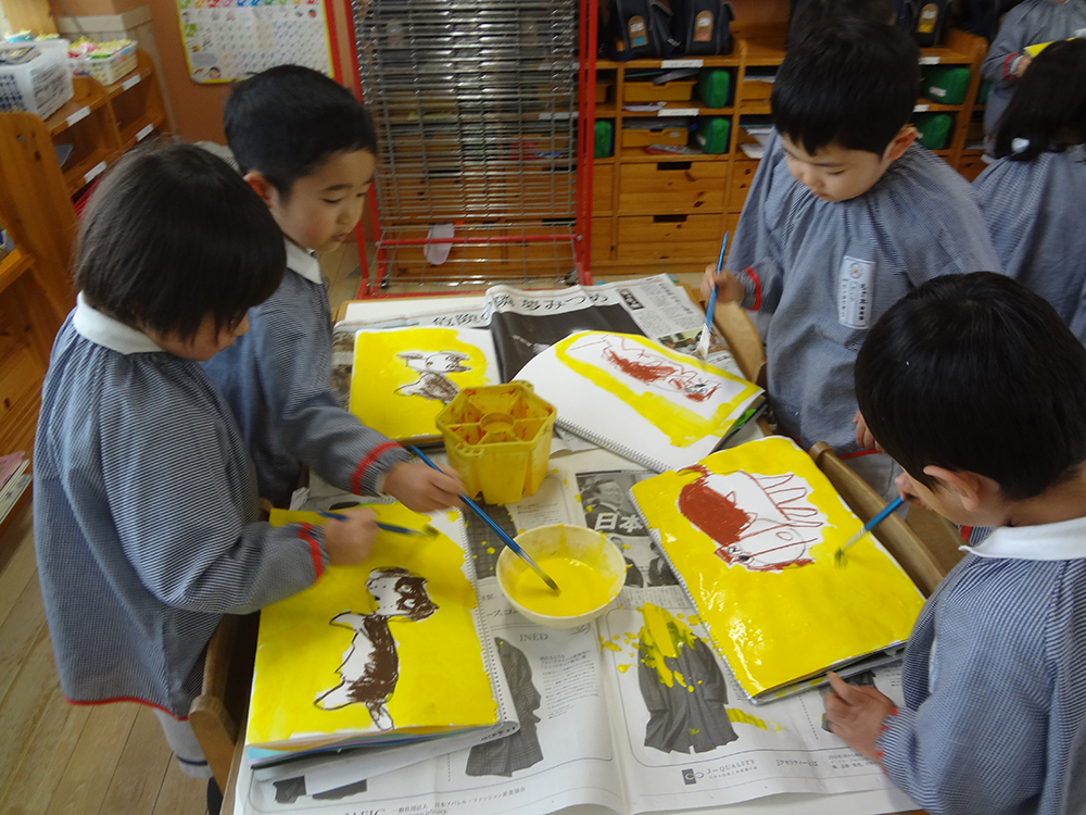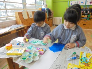 年中は、絵の具で好きな色を使って絵を描きました!