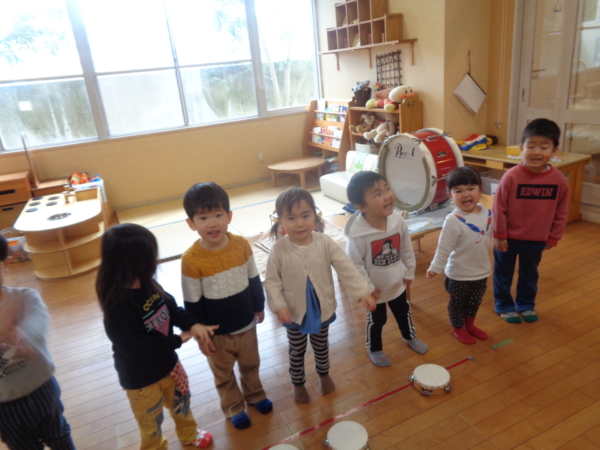 合奏は音楽に合わせて、楽器を叩くことを頑張っています!
