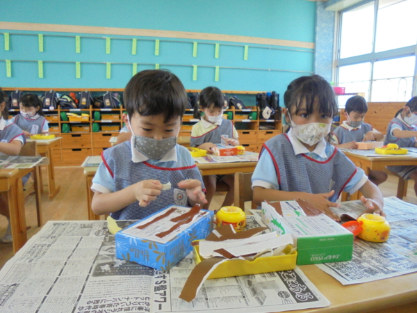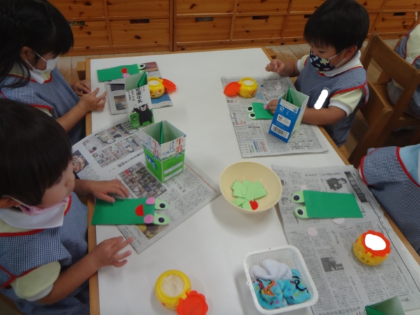 年少組は、かえるの体を牛乳パックに貼り付けました!